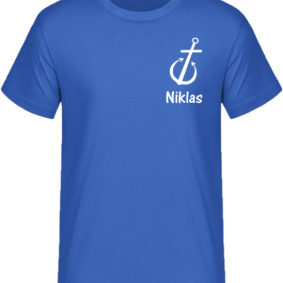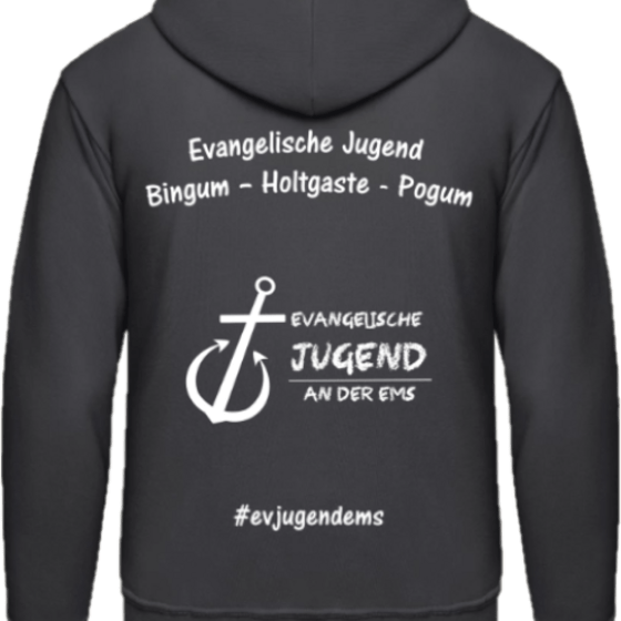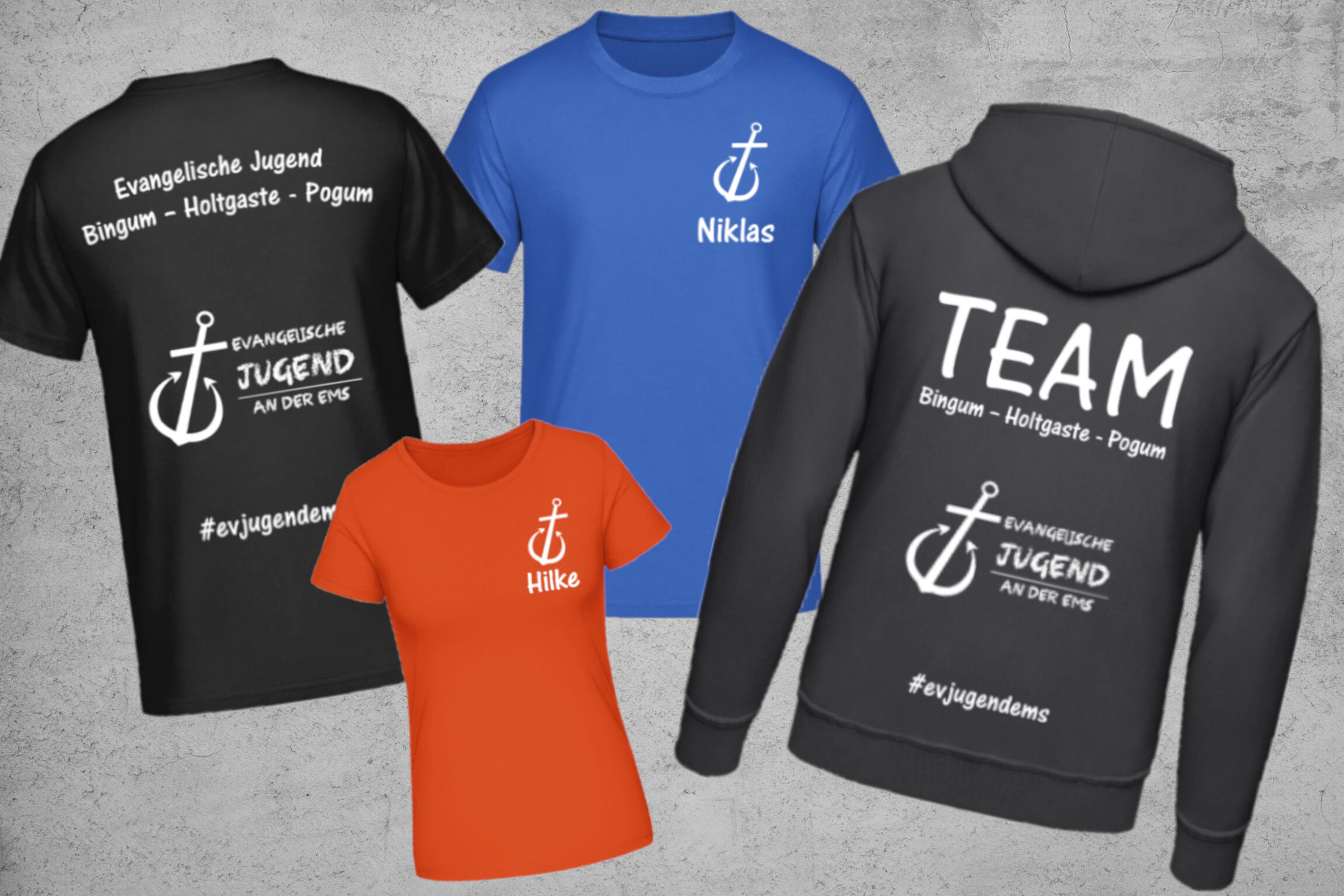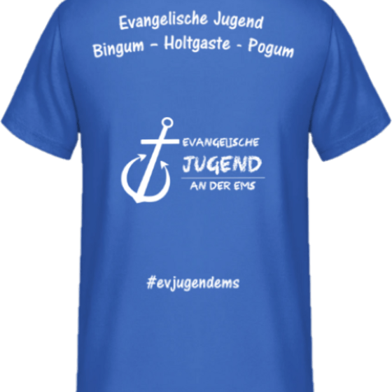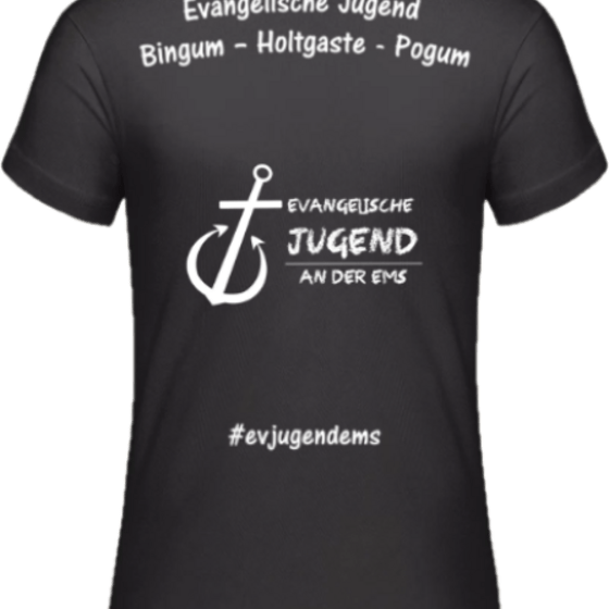 Es gibt ein Ev. Jugend Standard Shirt in schwarzem Design oder in Royal Blau und einen schwarzen Hoody.