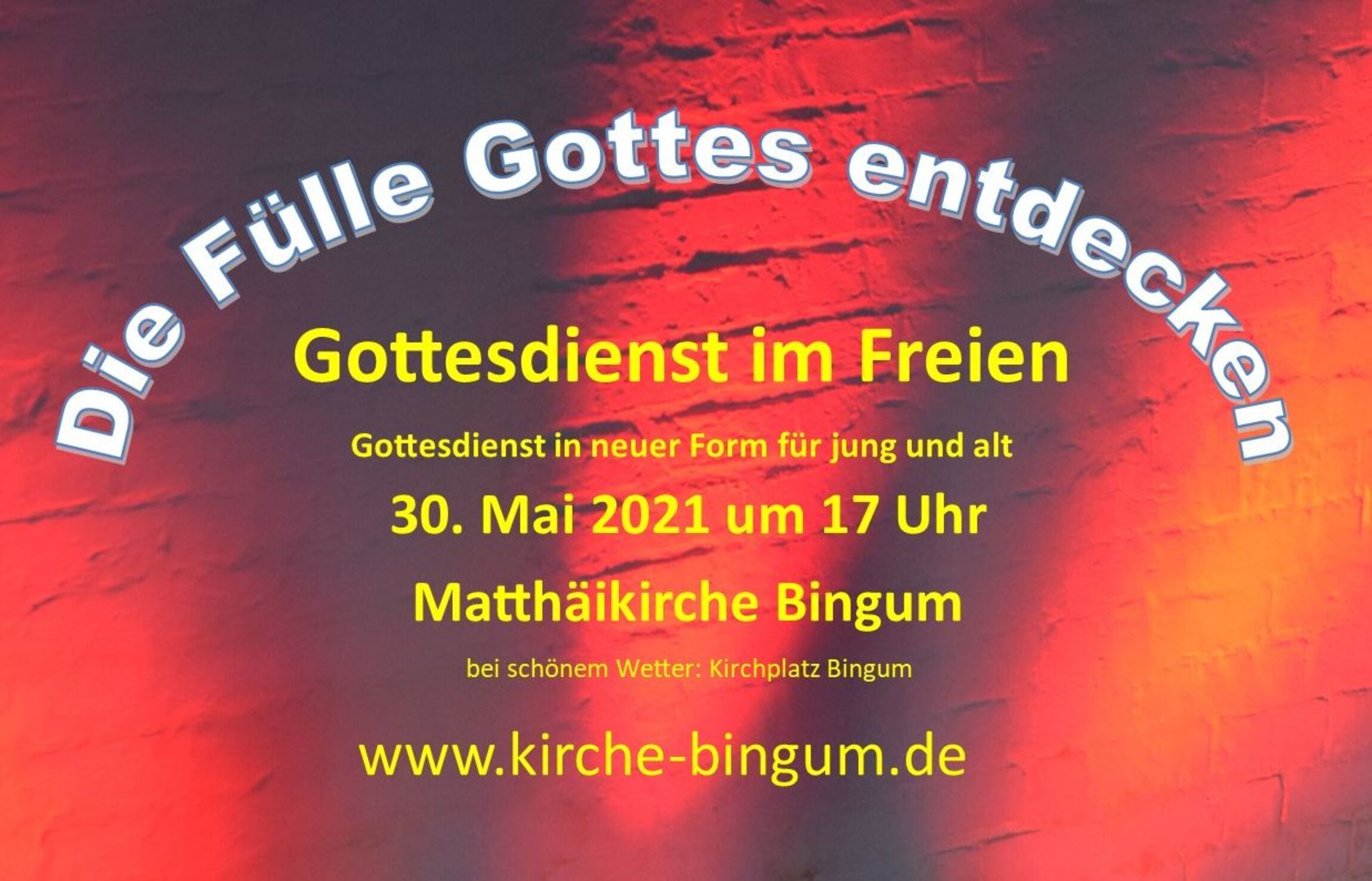 Für eine Corona-konforme Ausgestaltung bitten wir um eure Mitwirkung. Eine Voranmeldung ist möglich, aber nicht Voraussetzung für den Besuch des Gottesdienstes. Sollte das Wetter unbeständig sein, verlegen wir den Gottesdienst in die Bingumer Kirche.