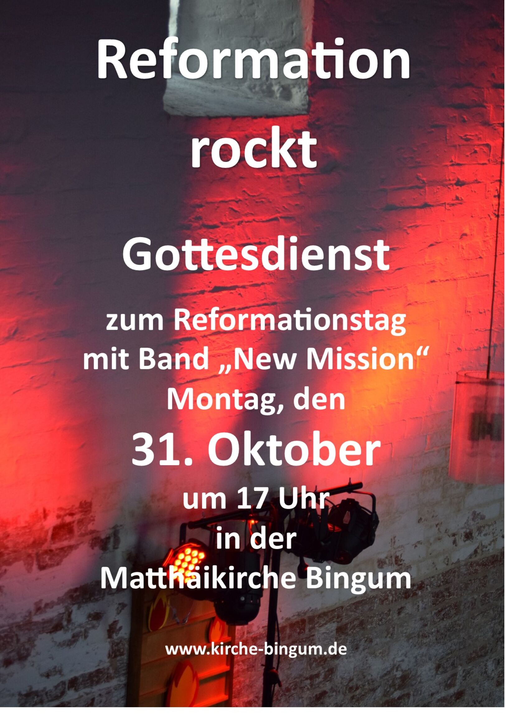 Der Reformationstag erinnert als Feiertag an die bis heute wirkenden Veränderungen der Reformation auf unseren Alltag. Die Bingumer Matthäigemeinde lädt dazu ein, sich mit rockiger Musik und den dazu gehörigen Texten auf die Spuren der Reformation zu begeben: Was bewegt uns? Was hat Reformation mit uns heute zu tun?