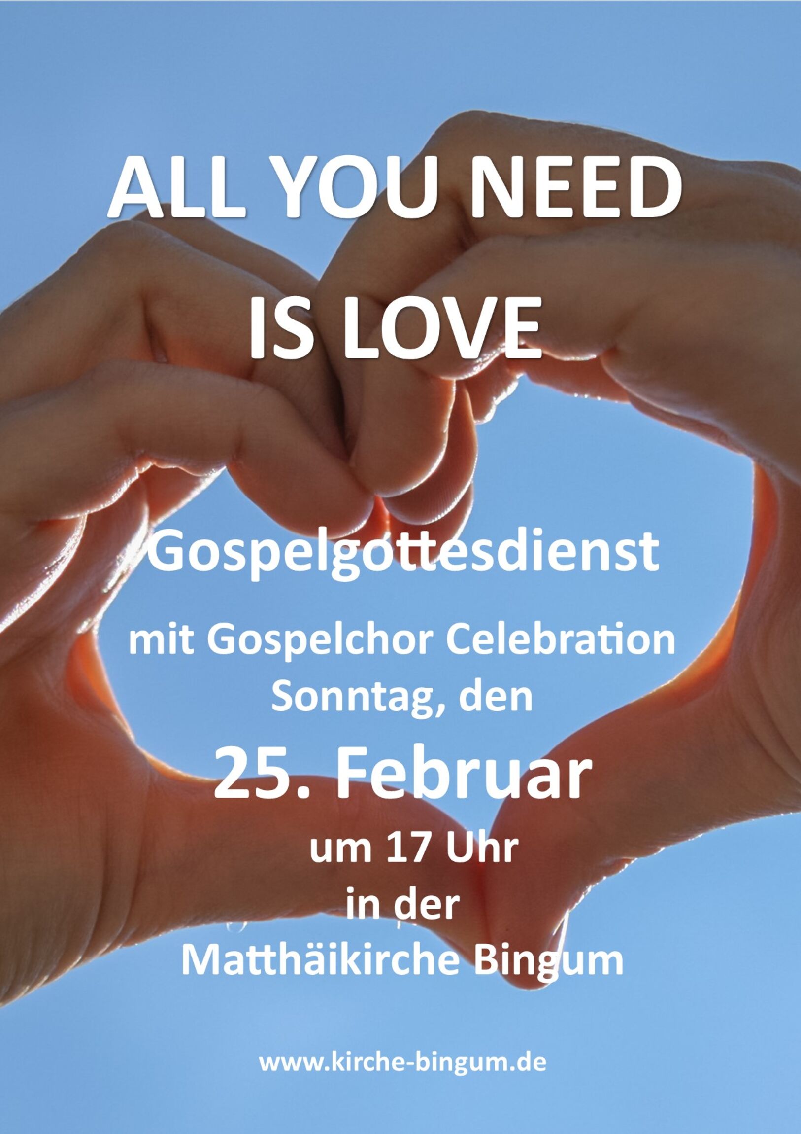 Am 25.02. um 17 Uhr laden wir zum Gospelgottesdienst in die Bingumer Matthäikirche ein. Der Chor Celebration hat wieder ein vielfältiges Programm zum Mitsingen und mit Vortragsstücken zum Lob Gottes vorbereitet.