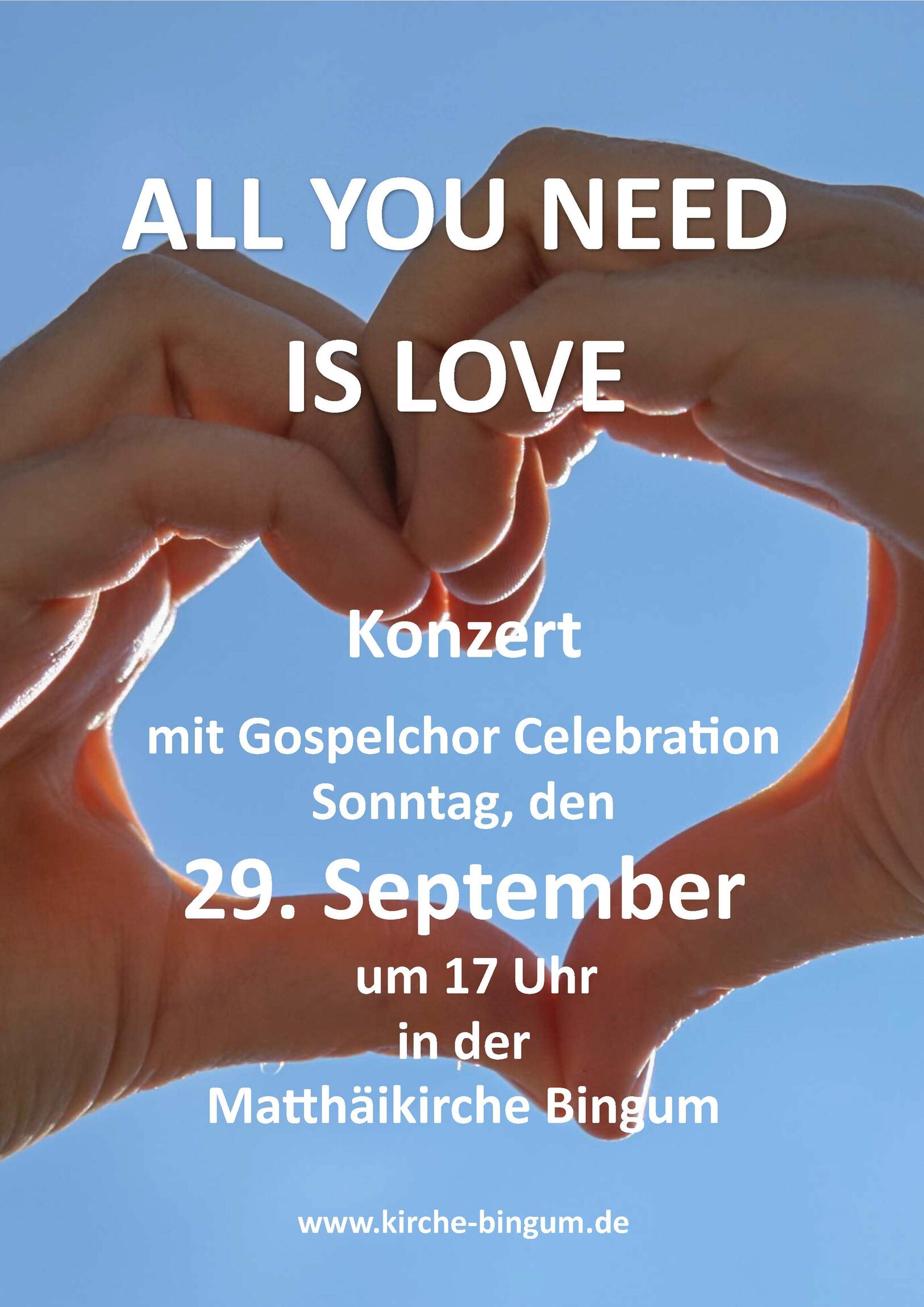Am 29.09.2024 um 17 Uhr laden wir zum Gospelkonzert in die Bingumer Matthäikirche ein. Nach dem großen Zuspruch für unseren Gospelgottesdienst "All you need is love" hat der Chor Celebration jetzt ein ganzes Konzert zu diesem Thema vorbereitet.