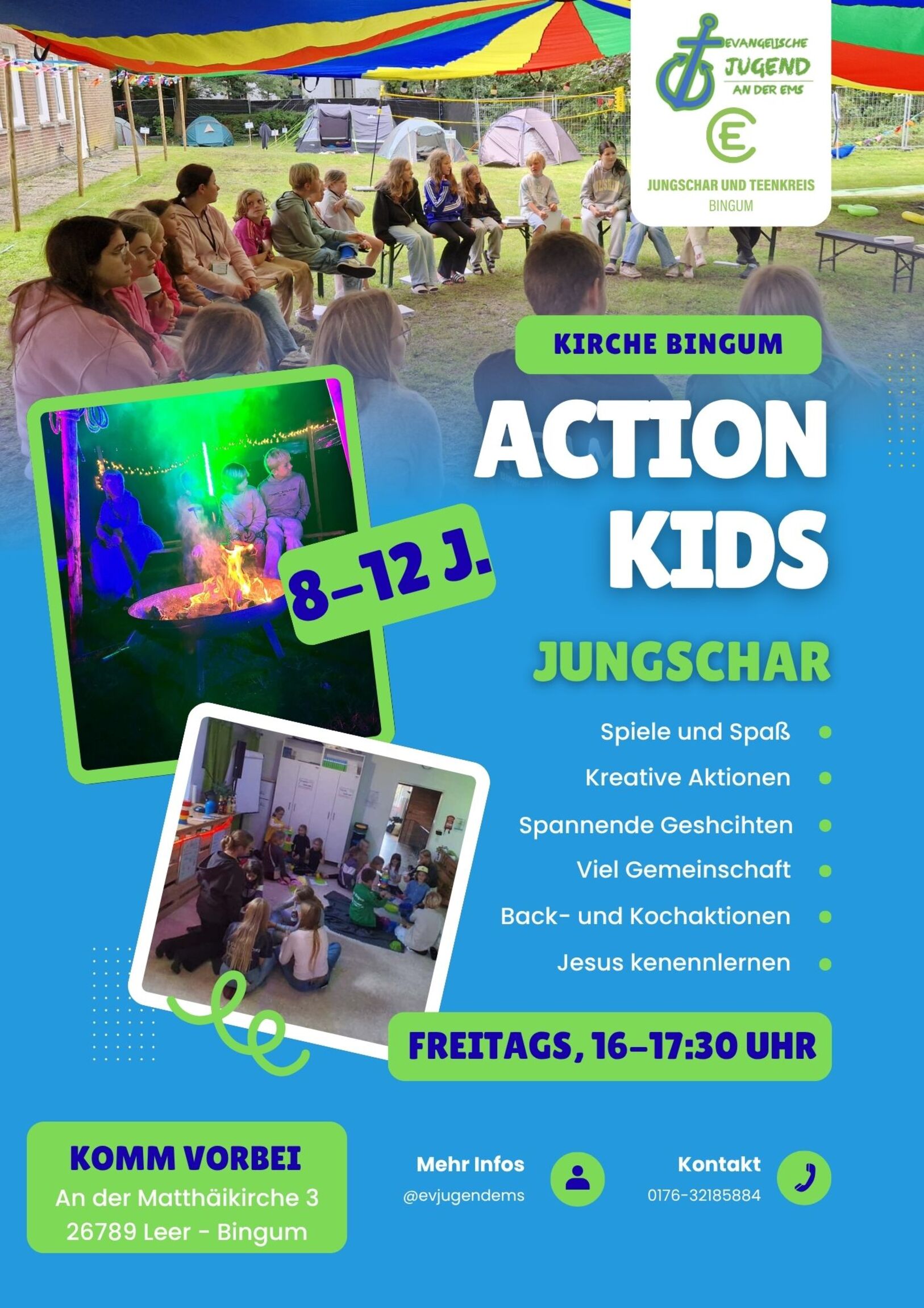 - Jungschar „Action Kids“– für Kinder von 8 bis 12 Jahren, immer freitags von 16:00 bis 17:30 Uhr (plus 30 Minuten Bring- und Abholzeit). Hier erwartet die Kinder ein buntes Programm mit Spiel, Spaß, Geschichten, Basteln und Gemeinschaft. Betreut wird die Gruppe von engagierten Teamer*innen der Gemeinde Bingum, unterstützt von Diakon Niklas Sonnenberg.